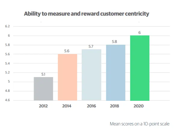 While organizations are getting better overall at measuring and rewarding employees for customer centricity, a deeper dive into the data shows that only 14% of executives in 2020, down from 20% in 2018, had corporate compensation tied to customer loyalty or a related measure. It’s “disappointing that companies are still struggling to link executive compensation to customer experience,” LeBlanc says. Until organizations essentially monetize CX improvements, she anticipates true customer centricity will continue to be a challenge.