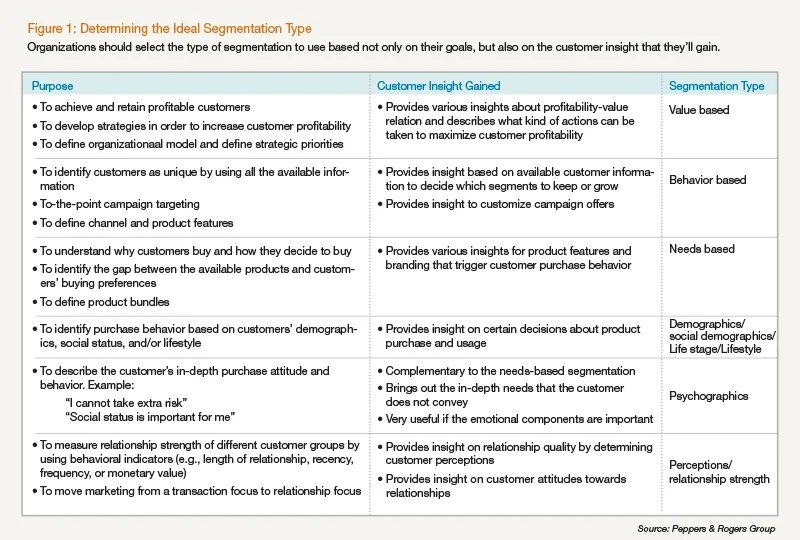 The first step towards a successful segmentation strategy is to determine a company's expectations and objectives (see Figure 1). Different usage expectations require different segmentation methodologies. Strategic objectives, including revisions of core business direction, organizational structure changes, and financial planning initiatives, require more stable and strategic segmentation methodologies. On the other hand, more tactical objectives, including product and service developments and marketing actions, require more frequently revised and detailed segmentation methodologies.